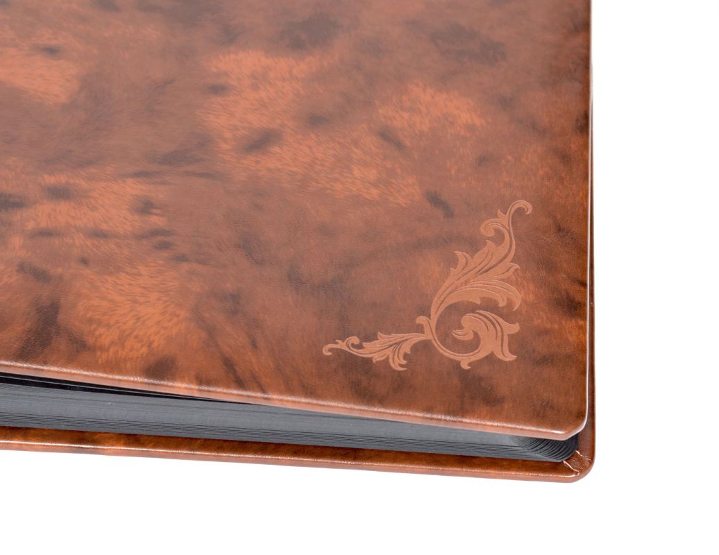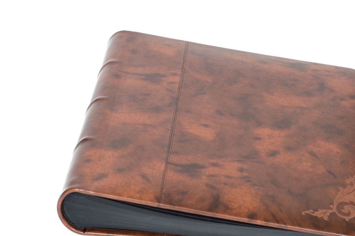 Ten piekny album zawdzięcza swój jakże elegancki wygląd mistrzom introligatorstwa. Zawarty w nim jest tradycyjny styl i elegancja co sprawia, że nie da się oderwać od niego wzroku. Dodatkowego prestiżu dodaje mu okładka ze skóry mielonej w kolorze cieniowanego brązu z delikatnym tłoczeniem oraz ozdobnymi przeszyciami na przedniej i tylnej okładce. Fotografie, które można umieścić na 50 czarnych kartach oddzielonych od siebie pergaminem nabiorą nowego blasku i zachowają kolory na długie lata. Jako opcje dodatkową możecie Państwo wybrać wyklejanie zdjęć.