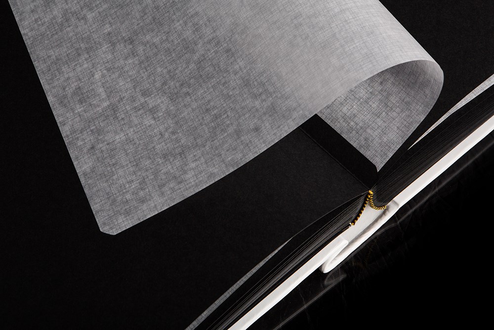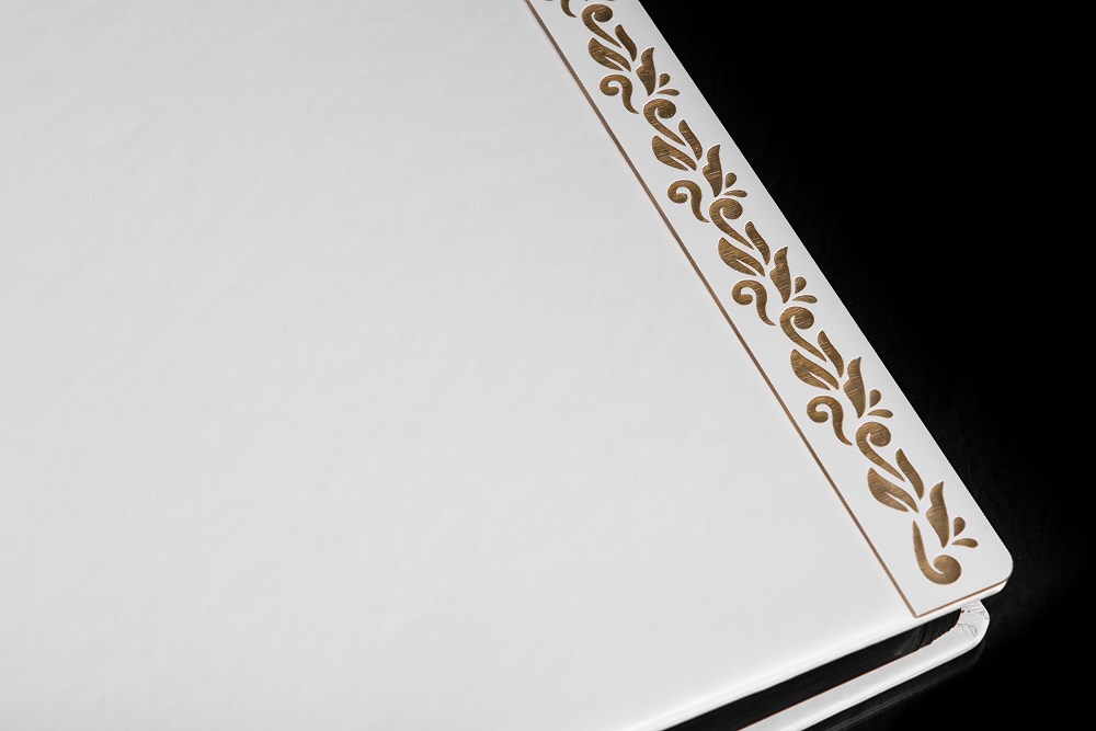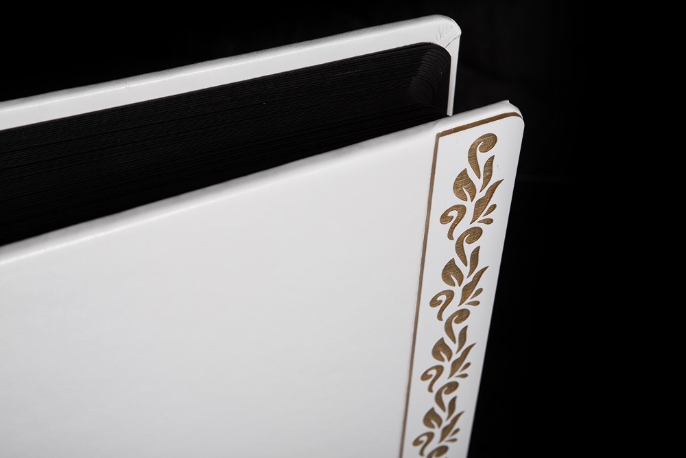Ten piekny album zawdzięcza swój jakże elegancki wygląd mistrzom introligatorstwa. Zawarty w nim jest tradycyjny styl i elegancja co sprawia, że nie da się oderwać od niego wzroku. Dodatkowego prestiżu dodaje mu okładka wykonana z białej ekoskory z zamieszczonym na jej prawej stronie ozdobnym akrylowym ornamentem. Fotografie ,które można umieścić na 50 czarnych kartach oddzielonych od siebie pergaminem nabiorą nowego blasku i zachowają kolory na długie lata. Jako opcje dodatkową możecie Państwo wybrać wyklejanie zdjęć.